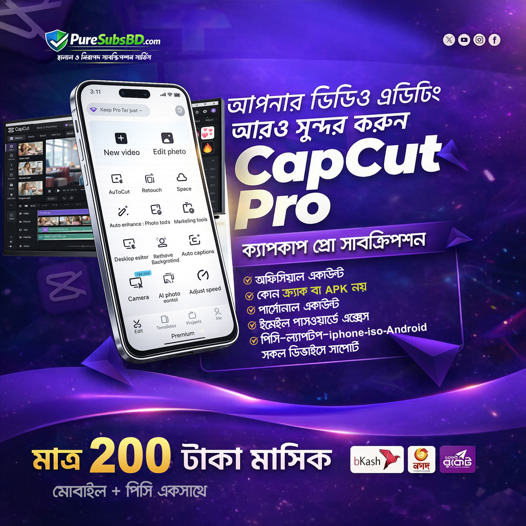 Be the first to review “১০০% অফিসিয়াল CapCut Pro এখনই নিন, মোবাইল ও পিসি একসাথে”